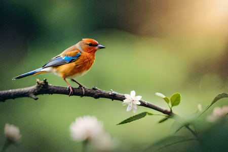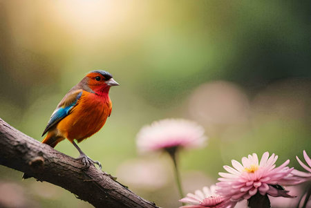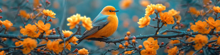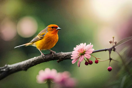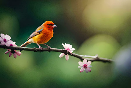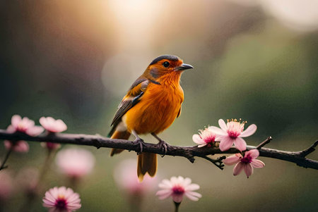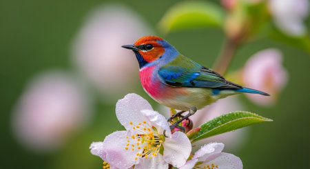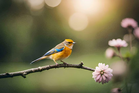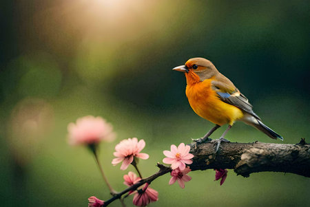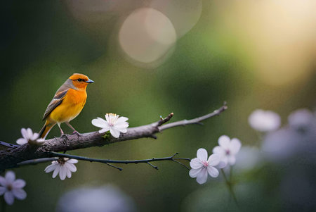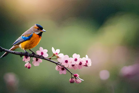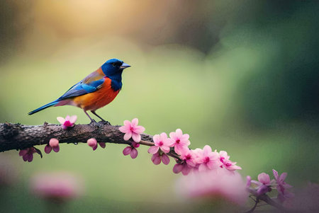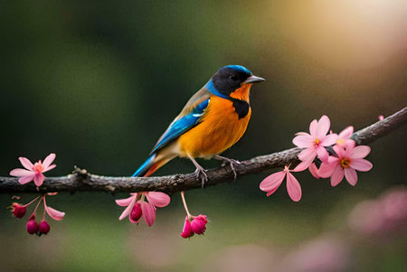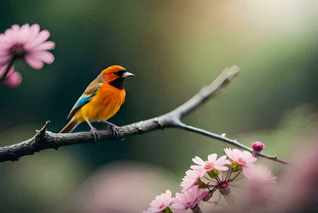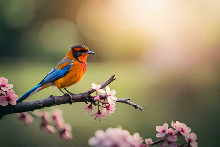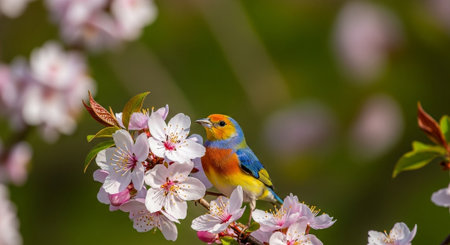 A stunning bird with bright colors sits gracefully on a branch adorned with blooming flowers, perfectly capturing the essence of spring and nature's vibrancy in soft light.