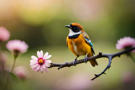 A stunning image of a colorful bird perched on a tree branch, surrounded by delicate pink flowers. Serenity and beauty.