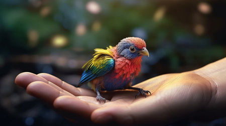 A bird with a blue head and red head sits on a pink flower. Created by Generative AI Tools