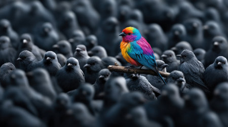 A single multicolored bird perched on a branch, standing out from a flock of grey birds