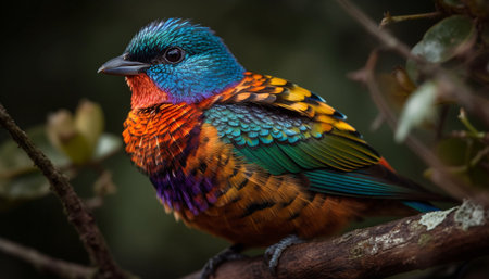 A vibrant bird with colorful feathers sits perched on a tree branch, surveying its surroundings. The birds plumage stands out against the green leaves of the tree.