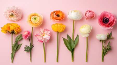A stunning arrangement of vibrant flowers showcasing a spectrum of colors against a soft pink background, ideal for spring themes and floral designs.