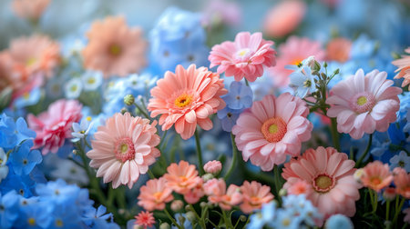 Bright flowers in various colors create a cheerful arrangement showing natural beauty and joy.