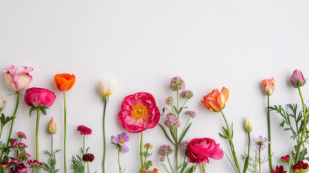 A vibrant collection of fresh flowers arranged artfully on a white background, showcasing a variety of colors and types. Perfect for design projects.
