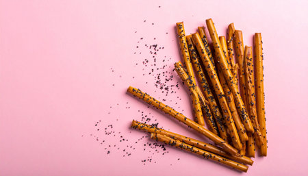 Salted crispy sticks with poppy seeds on pink background, top view