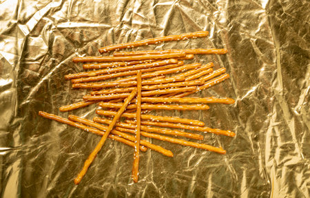 Bread Sticks, Pretzel Straws, Sesame Grissini, Pretzels Snack with Sesame Seeds, Long Rusks on Gold Background Top View
