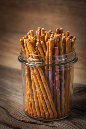 a salted sticks pretzels on wooden background