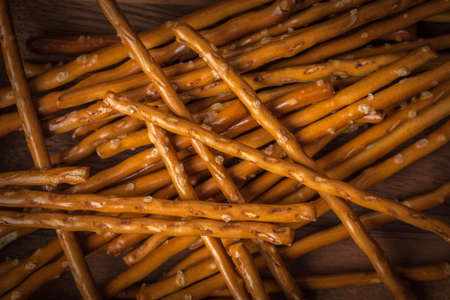 Salted dough straw, salted mkreker snack, crispy breadsticks, close-up background, horizontal pattern and bakery products