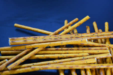 Tasty and sweet straws with poppy seeds made of flour, sneking scattered on a black plastic background.