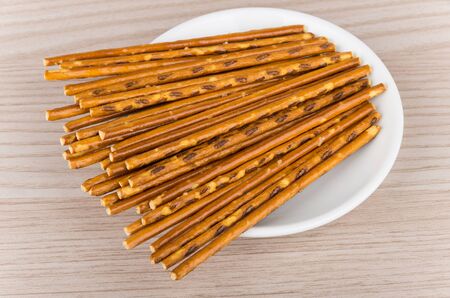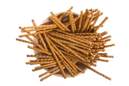 Salted sticks in a wooden plate on white background, top view