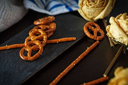 Typical German Bretzel. German food and snack. Delicious savory appetizer for lunch. Salted cracker bottom on slate bottom