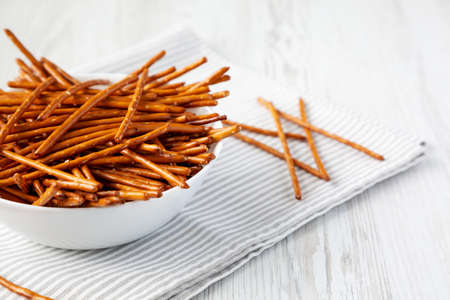 Organic Salty Pretzel Sticks in a Bowl, side view.