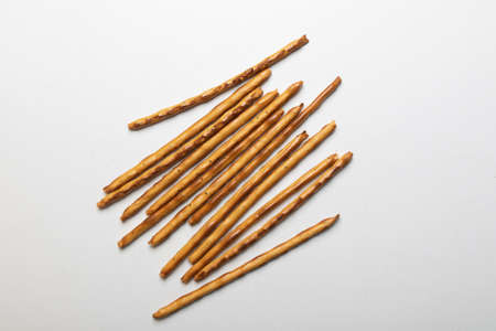 Bread sticks straws with salt on a white background. Salty snacks.