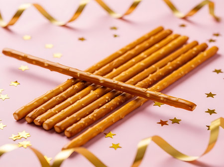 This image features a collection of pretzel sticks arranged neatly on a pink background. The pretzels are organized in a crisscross pattern, creating an appealing visual effect. Surrounding the pretzels are decorative elements, including golden star-shaped confetti and ribbon-like streamers, adding a festive touch to the overall composition.