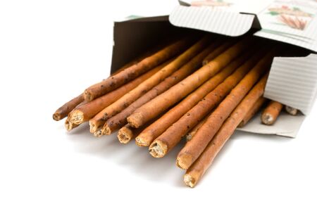 Brown, delicious pretzel sticks over white background