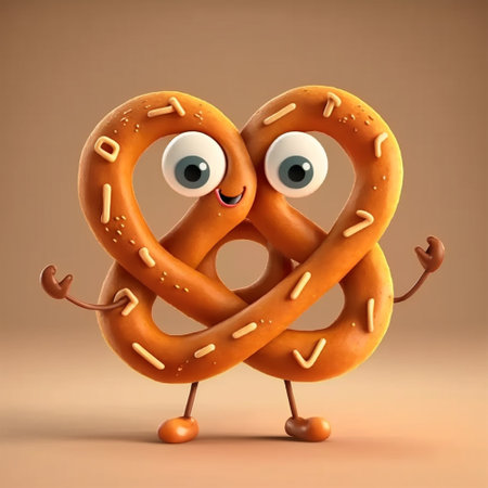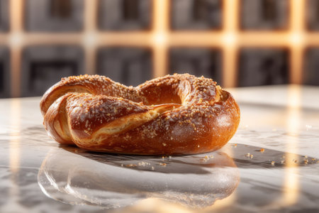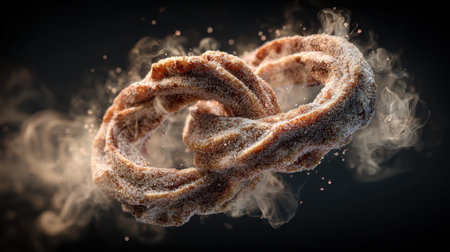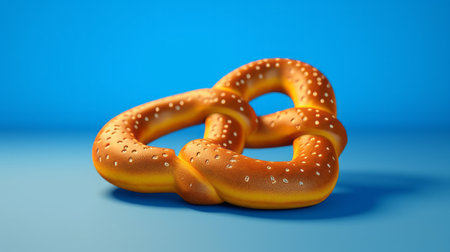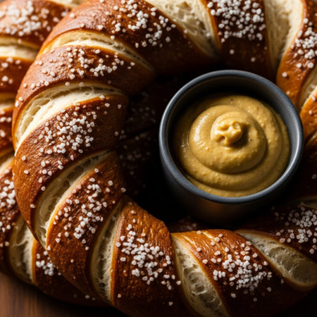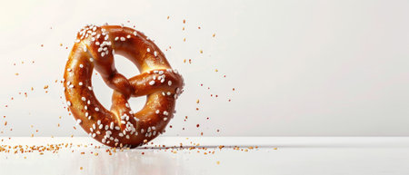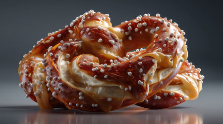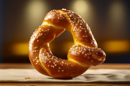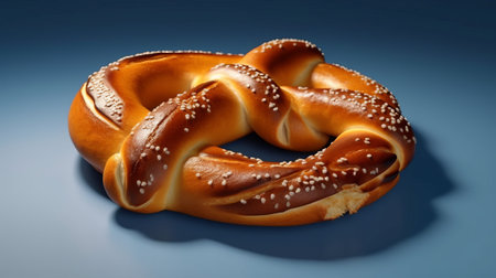 A close up shot of a freshly baked pretzel with coarse salt, set against a warm brown backdrop, perfect for food-related projects.