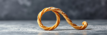 Delicious Fresh pastry on dark background with flour. Sweet pretzels with powdered sugar, macro. Beautiful delicious puff pastry