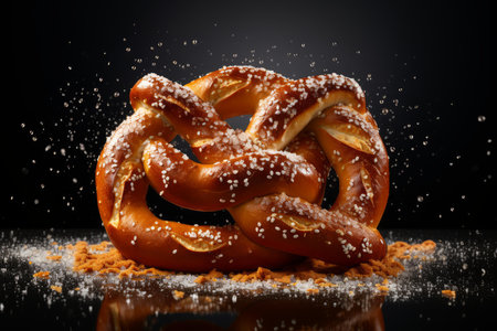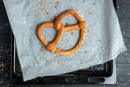 Pretzel or Bretzel, traditional German beer snack, a wheat bread with salt, overhead flat lay shot on a black background