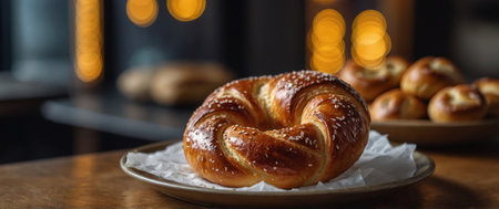 Typical German Bretzel. German food and snack. Delicious savory appetizer for lunch. Salted cracker bottom on slate bottom