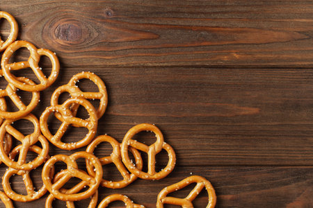 Pretzels on wooden background with empty space for text. Pretzels flat lay, top view, copy space