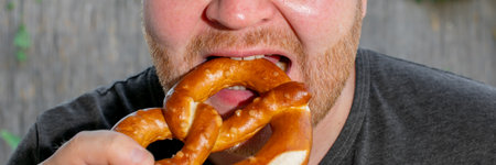 A Caucasian man enjoys a fresh pretzel, showcasing German culinary traditions during Oktoberfest celebrations