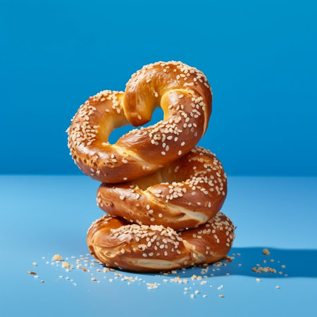 Crunchy pretzels are scattered on a bright purple surface, highlighting their golden color and sesame seed topping. Perfect for snacking at any time of the day or for gatherings.