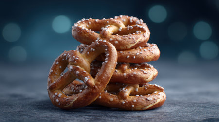 A visually appealing stack of delicious soft pretzels sprinkled with coarse sea salt, presented against a blurred background. Perfect for food photography.