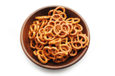 Pretzels in a Round Wooden Bowl Over White
