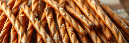 Crunchy pretzel sticks arranged neatly on a wooden surface with a sprinkle of sea salt