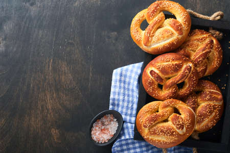 Two homemade freshly baked soft pretzels on black backround. Traditional Bavarian pretzel for Octoberfest. Top view, web banner, copy space