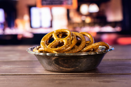 Lot of whole mini salted pretzels in old iron bowl in a restaurant