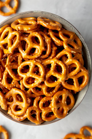 Mini Pretzels with Salt in a Bowl on a gray background, top view. Flat lay, overhead, from above.