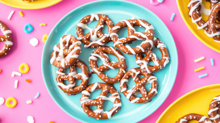 A vibrant display of chocolate-covered pretzels on a lively background, perfect for snacks or dessert tables. Ideal for festive celebrations and gatherings.