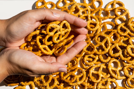 Crispy salty pretzels are laid out on a white background. Top view. Concept: quick snack, food photography, holidays and vacations, cafes and bistros, Christmas food.