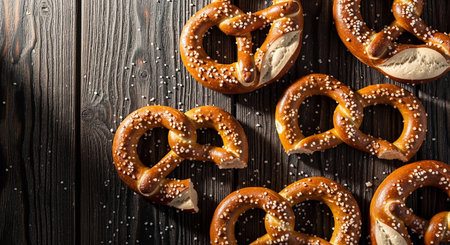 Bavarian pretzels on a rustic wooden background.