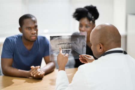 Panoramic x-ray jaw. A dentist holding an x-ray the patient's tooth and indicates the problem