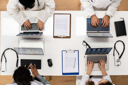 Medical technology network team meeting concept. Doctor hand working smart phone modern digital tablet laptop computer medical chart interface, compact server foreground