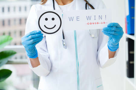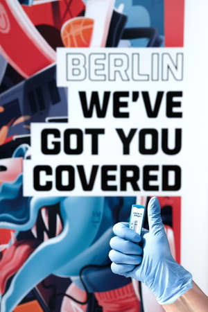 Hand in glove holds express COVID-19 test for coronavirus in front of plackard with text Weve got you covered . Negative test allows berliners to go shopping and visit hairdressing salons.