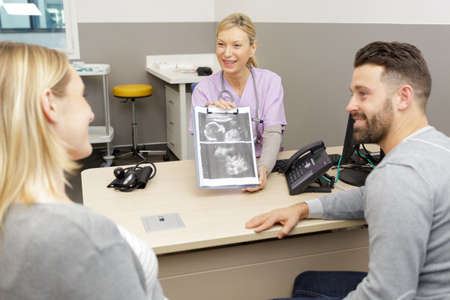 The doctor holds an ultrasound scan of a pregnant girl in the hand. High quality photo