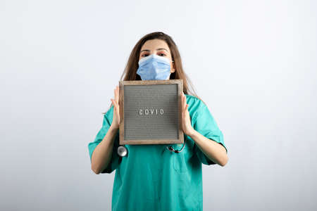 Young beautiful nurse in medical mask with stethoscope holding a frame