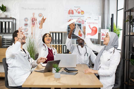 Group of four diverse medical specialists throwing up papers after long and hard discussion at office. Meeting over with success. International cooperation.