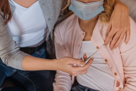 Cropped view of mother holding thermometer near child in medical mask