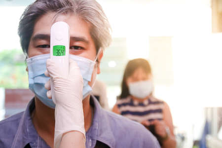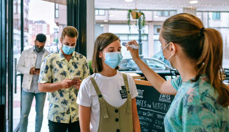 waitress wearing a mask and checking body temperature of customer by sensor uses an Medical Digital Infrared Thermometer before entering restaurant for Protect from Coronavirus (COVID-19) Outbreak.