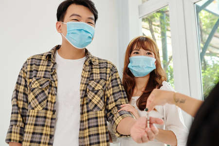 Two asian people,campaign wearing protective mask before leaving the home in risk areas of disease,smog,dust,air pollution,protection infection of coronavirus NCoV 2019,pandemic of Covid-19 virus