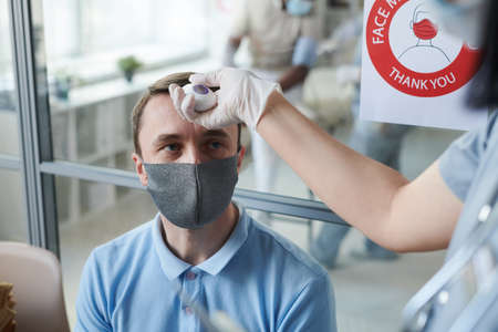 Gloved hand of young doctor or nurse measuring body temperature of patient