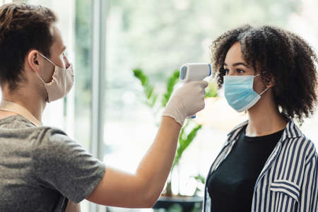 Young manager in protective mask and gloves checking temperature on client forehead at beauty salon, side view