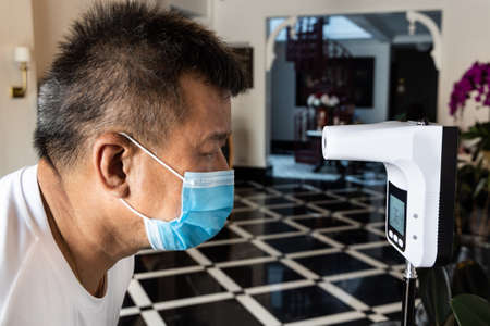 Asian man checking forehead temperature using infrared thermometer before enter establishment as part of new normal requirement