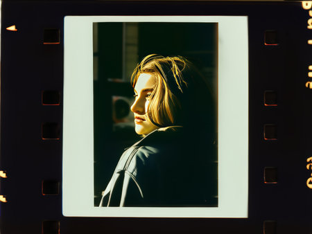 A film strip is placed under bright light, casting shadows and revealing details. The frames on the strip show varying sections, hinting at scenes captured on film.