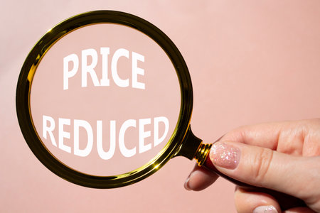 Price reduced symbol. Magnifying Glass with Concept word Price reduced. Beautiful pink background. Businessman hand. Business and Price reduced concept. Copy space