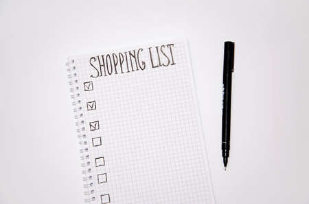 Shopping list. Squared notebook with black pen on a white background. Record ideas, notes, plans, tasks. The list includes bread, milk, bananas. Copy spase